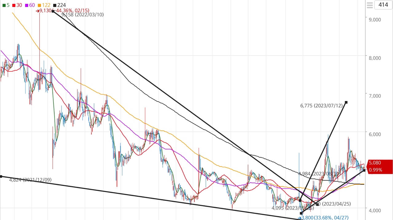 9,130원 최고점을 찍은 22년 1월부터 23년 4월 약 1년2개월 동안 계단식 하락을 했다. 그리고 최저점 3,800원을 찍고 고점 대비 240% 떨어졌다. 계단식 하락을 하면서 3~4달 주기로 긴꼬리 양봉을 만들면서 매집봉을 만들었다. 단기적 상승세를 보인 5월부터 장기이평선인 112일선을 돌파하고 연이어 3일만에 224일선을 돌파하여 5,620원 최저점대비 47%까지 올라갔다. 이후 4일간 조정을 주면서 4,665원(-20%)까지 떨어졌다. 그리고 약 보름간 쌍바닥을 만들고 전고점까지 오르면서 쌍고점을 만들었다. 또 다시 보름간 조정을 주고 있으며 아직 상승추세선은 무너지지않고 있다.