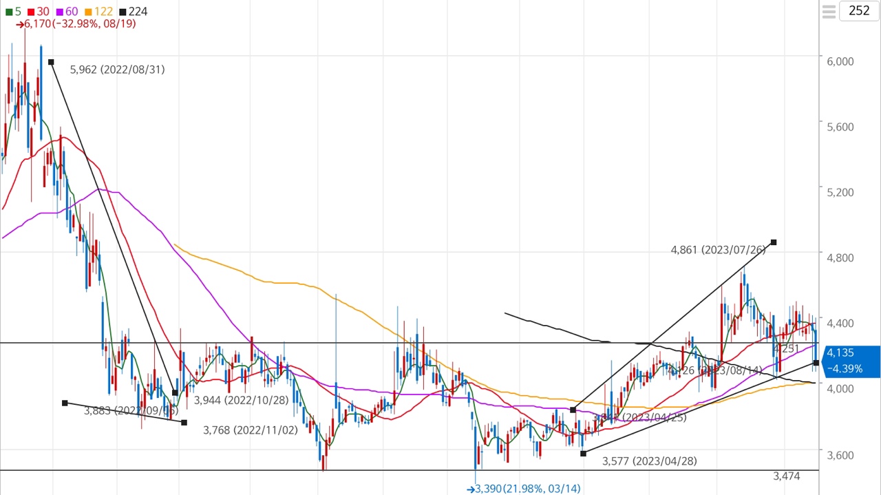 22년 8월 5,962원 고점을 찍고 3개월간 -57%(3,780원) 급락했다. 그리고 12월 말일 3,400원 최저점을 찍고 23년 6월까지 6개월간 4,330원과 3,390원 사이의 박스권에서 횡보를 했다. 7월4일 4,330원 박스권의 고점을 돌파하면서 상승추세를 이어갔다. 단기적인 4,860원까지 2차파동이 나오고 오늘까지 4,135원(-17%) 조정을 받고 있다. 중장기적 상승추세의 하단부분까지 내려와 있는 상황이다.